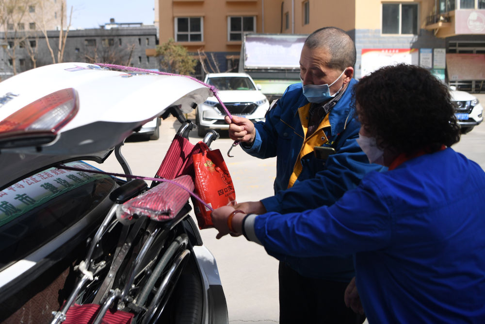 强汉红(左)和同事胡建萍将老人的轮椅放入后备箱并固定好准备出发(3月1日摄)。新华社记者陈斌摄