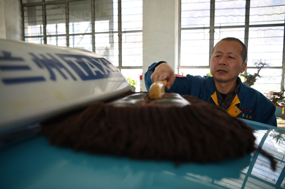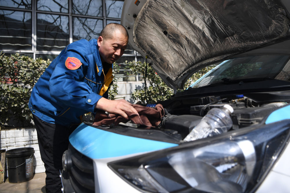 强汉红在出车前擦拭车辆(3月1日摄)。新华社记者陈斌摄