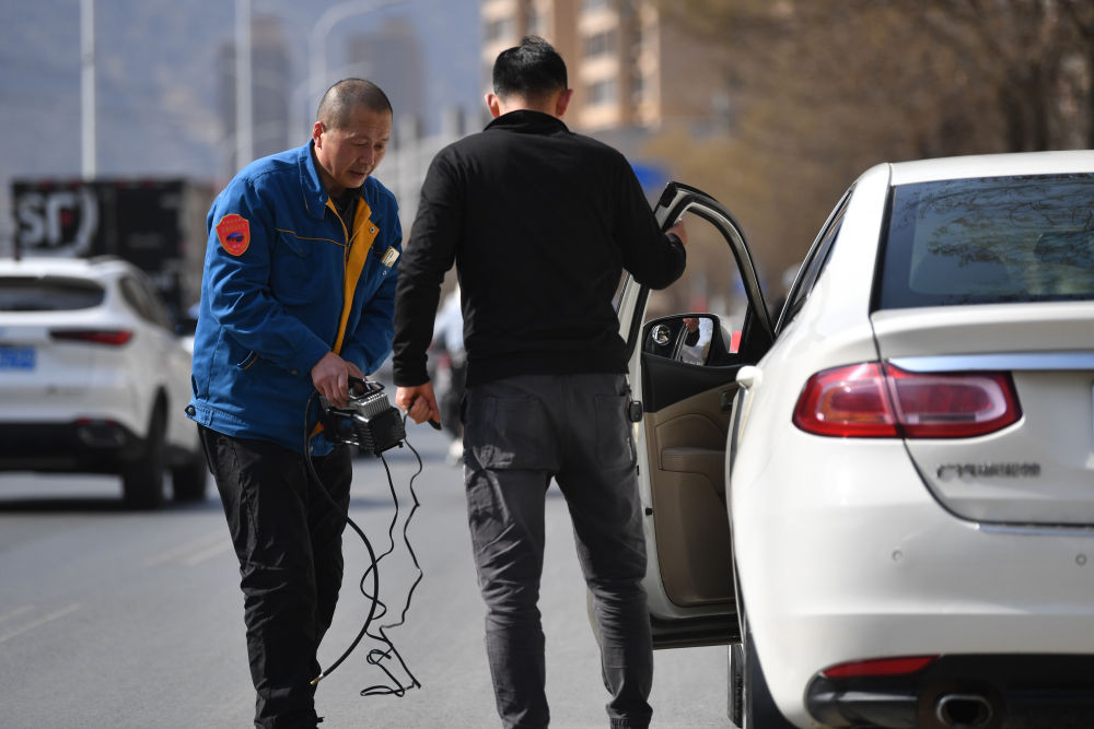 强汉红在路上帮助一名车主检查解决车辆轮胎故障(3月1日摄)。新华社记者陈斌摄