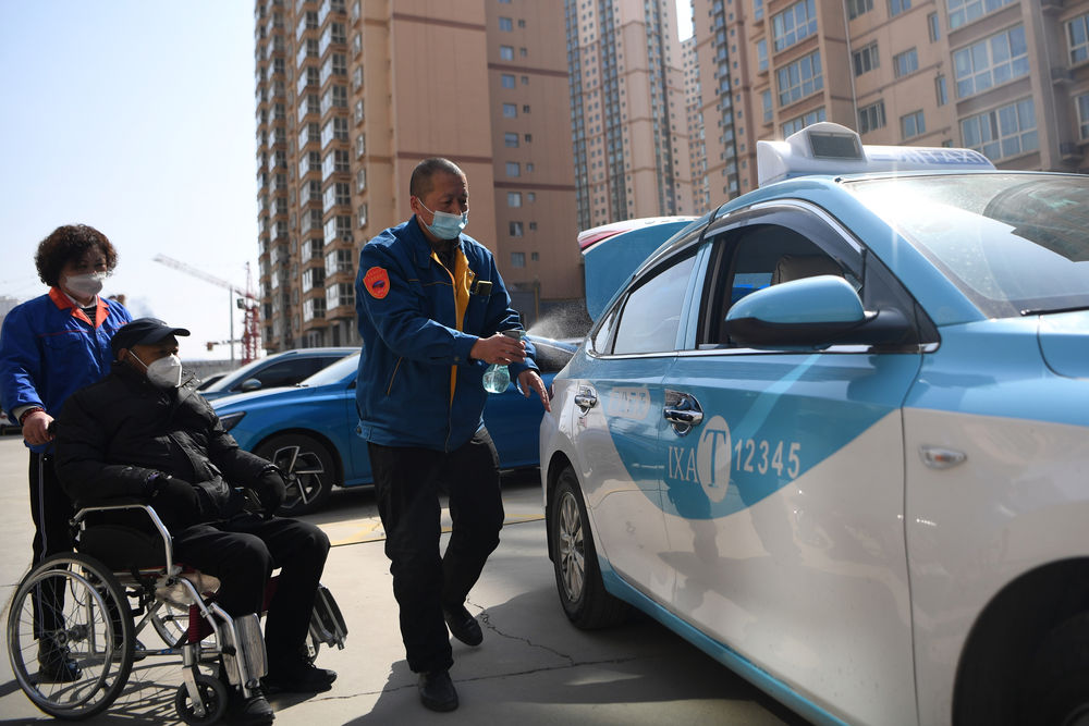 强汉红(右一)在老人上车前给车辆消毒(3月1日摄)。新华社记者陈斌摄