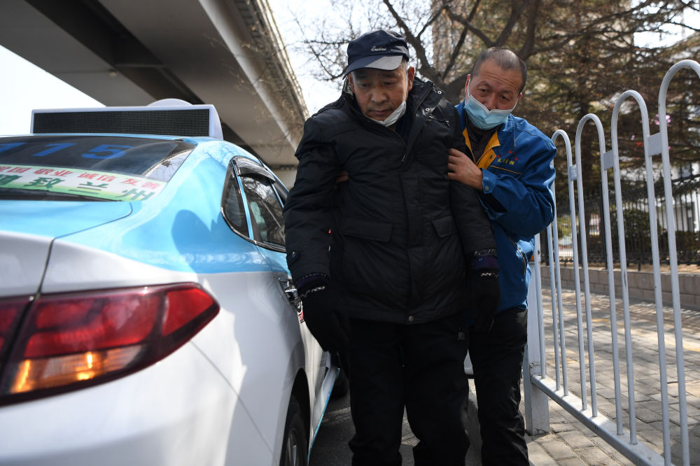 强汉红搀扶行动不便的老人下车准备就医(3月1日摄)。新华社记者陈斌摄
