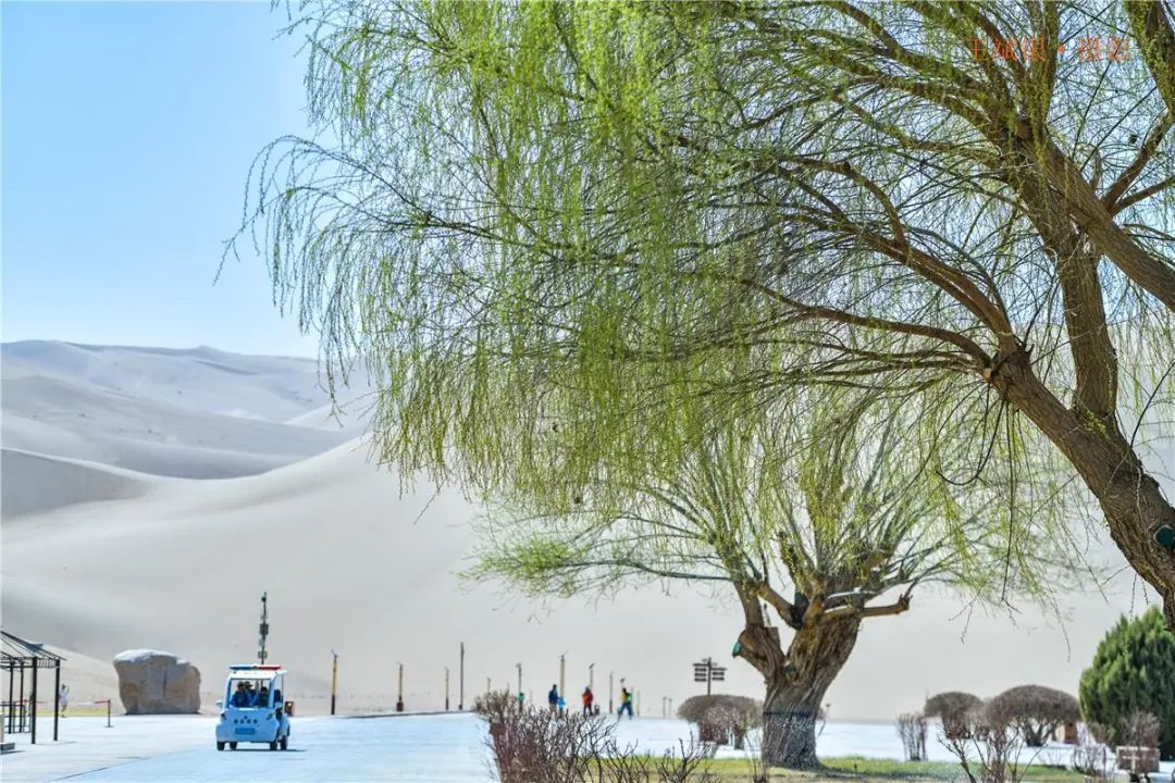 三月的敦煌,万物复苏,春暖花开。鸣沙山下千亩杏花次第绽放,垂柳发芽吐绿,一...