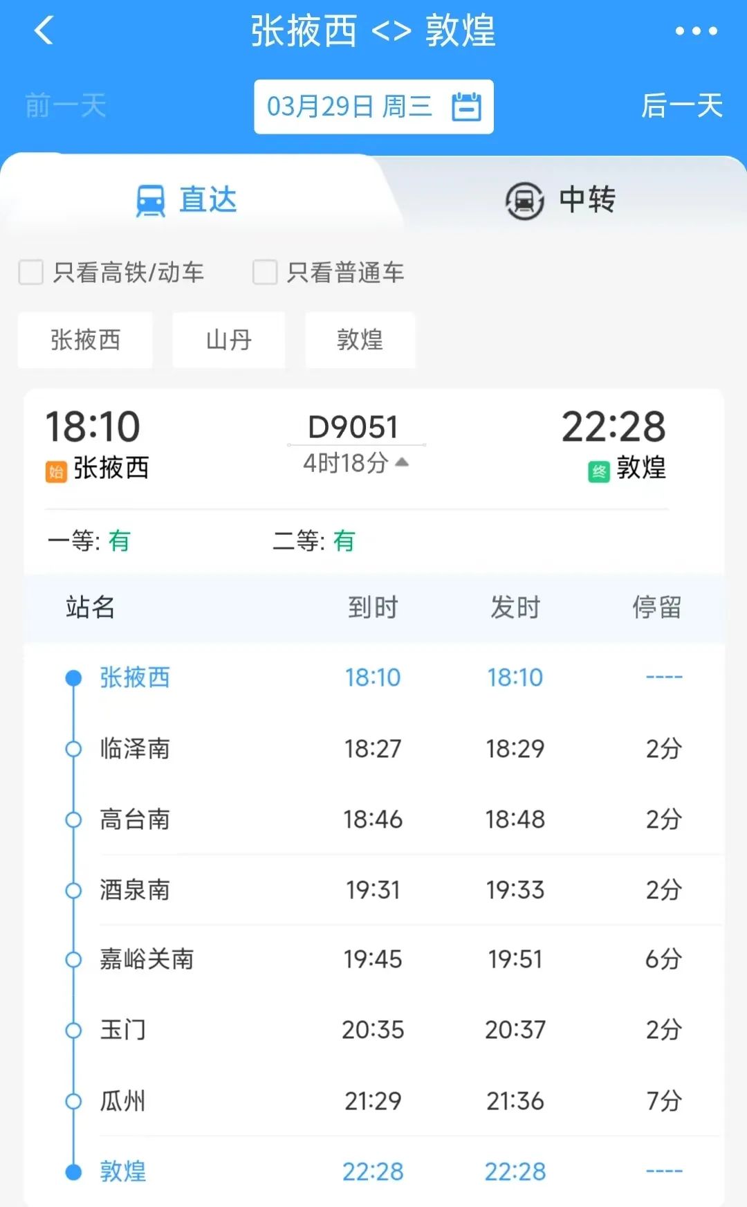 D9051次列车张掖西18:10开车,经停临泽南(18:27到、18:29发)、高台南(18:46到、18:48发)、酒泉南(19:31到、19:33发)、嘉峪关南(19:45到、19:51发)、玉门(20:35到、20:37发)、瓜州(21:29到、21:36发),到达敦煌(22:28),历时4小时18分。