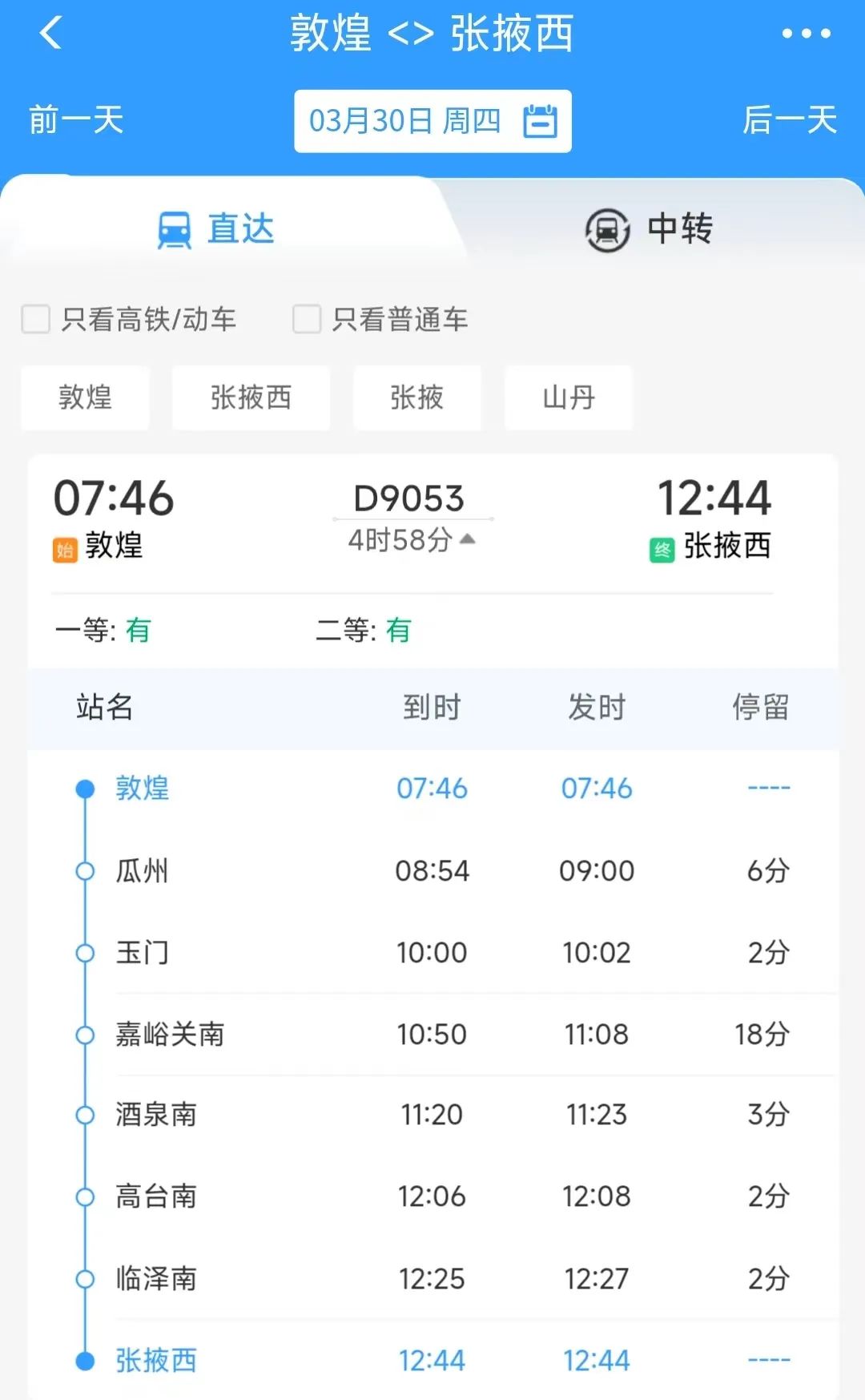 次日D9053次列车敦煌7:46开,经停瓜州(8:54到、9:00发)、玉门(10:00到、10:02发)、嘉峪关南(10:50到、11:08发)、酒泉南(11:20到、11:23发)、高台南(12:06到、12:08发)、临泽南(12:25到、12:27发),到达张掖西(12:44),历时4小时58分。