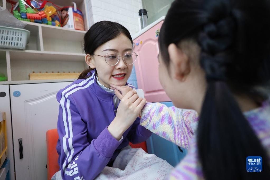 3月30日,特教老师陈进为孤独症儿童指导发音训练。新华社记者马希平摄