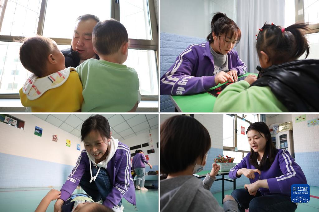3月31日,兰州欣雨星儿童心理发展中心的特教老师们为孤独症儿童进行康复训练(拼版照片)。新华社记者马希平摄