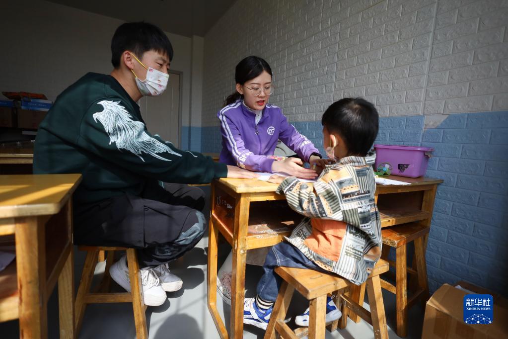 3月30日,特教老师陈进(中)为儿童进行精细动作评估。新华社记者马希平摄