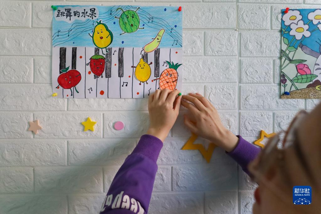 3月31日,特教老师陈进把孤独症儿童的绘画作品钉在墙上。新华社记者马希平摄