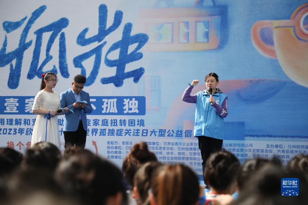 4月1日,特教老师陈进(右)在兰州一孤独症日公益活动上带领志愿者们宣誓。新华社记者马希平摄