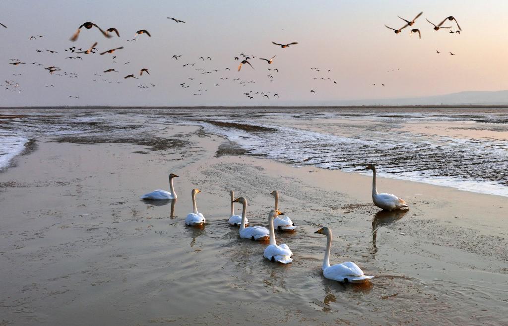 2月3日,一群天鹅在黄河湿地(无人机照片)。近日,黄河西岸的合阳黄河湿地自然保护区内,天鹅今年首次规模出现,数量近千只。合阳黄河湿地自然保护区位于陕西省合阳县。新华社发(崔正博摄)