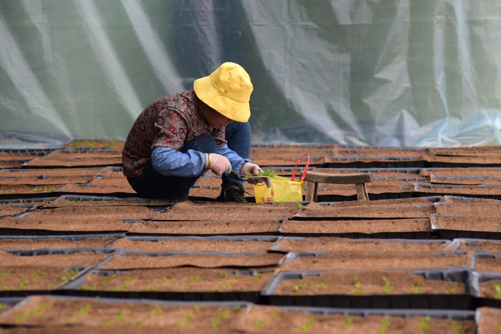 3月2日,在定西市渭源县五竹马铃薯良种繁育专业合作社,工作人员正在进行马铃薯脱毒苗切段繁育。新华社记者张智敏摄