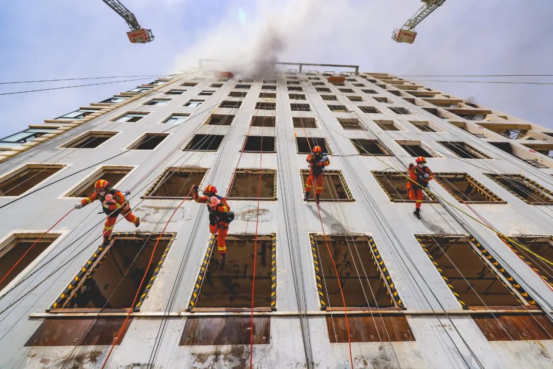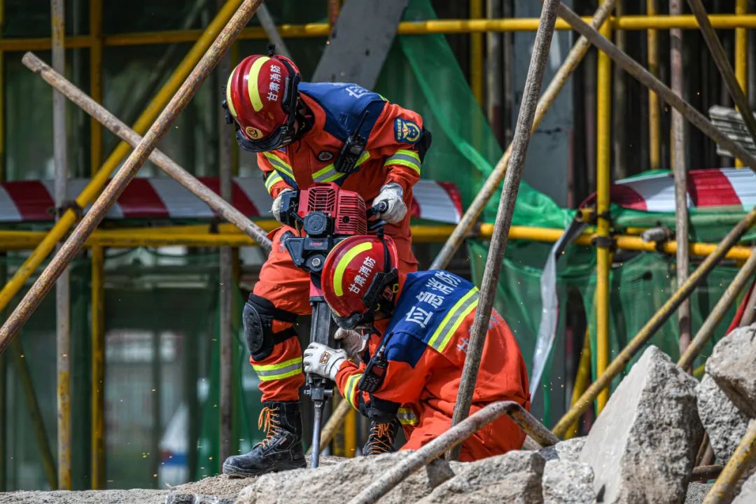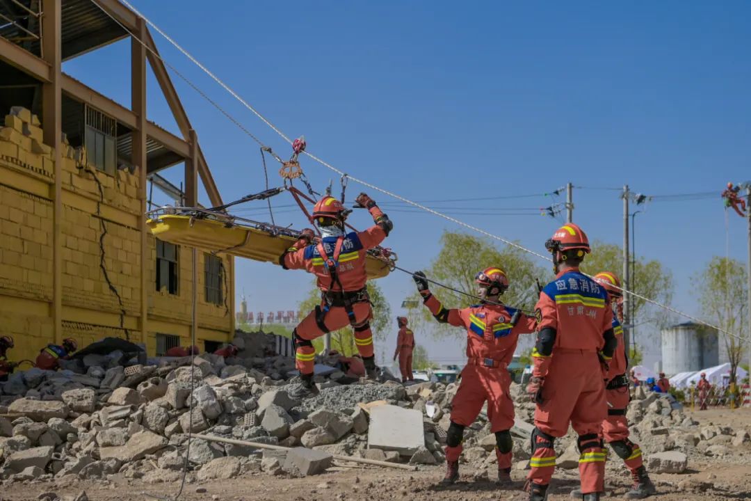 逼真演习场上,救援力量整装待发,尖端装备轮番出场。拉动检验阶段,甘肃省消防救援总队立即启动一级响应,按照省委、省政府统一部署,调集全省消防救援力量采取模块化编组、立体化投送形式赶赴灾区,兰州新区消防救援力量第一时间赶赴现场,发挥就近处置作用,搜救震区被困群众。指挥演习阶段,甘肃省消防救援总队总队长陆军、政委蔡建波分别在总队前方指挥部、总队指挥中心对灾情进行研判,调度全省消防救援力量展开救援行动;副总队长张鸿斌、戚文军在现场组织战勤保障力量,统筹指挥救援力量。综合演习阶段,全省消防救援队伍参演力量在主、分演习场投入到地震废墟搜救、商业综合体火灾扑救、人员密集场所火灾扑救、高层建筑火灾扑救、石油化工火灾扑救及大型社区人员疏散、堰塞湖险情处置、泥石流滑坡抢险等演习科目中。