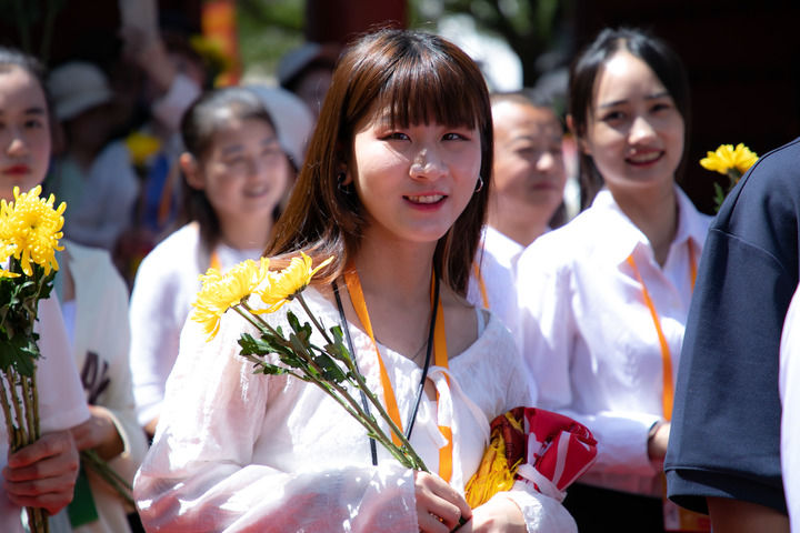 6月22日,台湾辅仁大学学生李以琳参加完公祭伏羲大典后前往伏羲庙献花。