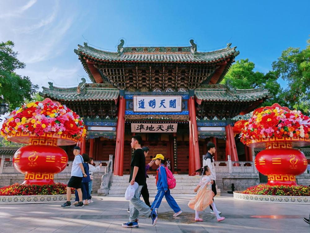 走进天水西关一座由太极八卦元素装饰的城门,沿着古街大道前行,便来到伏羲庙前。只见飞檐斗拱的庙门上高悬两方匾额“开天明道”“与天地准”,庙貌巍峨。