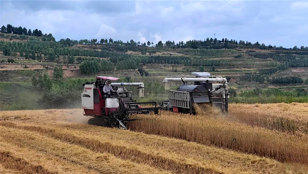 在庄浪县盘安镇牡丹村的梯田麦田里,两台收割机正联合作业,不到几个来回,一块三四亩大的小麦田就收割完毕。为确保小麦颗粒归仓,该镇组织协调各类收割机械,积极引导广大种粮户抢抓晴好天气,科学有序开展小麦收割。