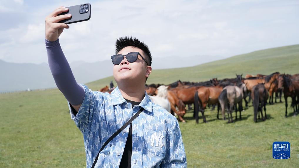 在甘肃山丹马场上,来自台湾的新媒体人林惟纲举起手机,与风姿各异的骏马合影留念(7月19日摄)。新华社记者 黄扬 摄