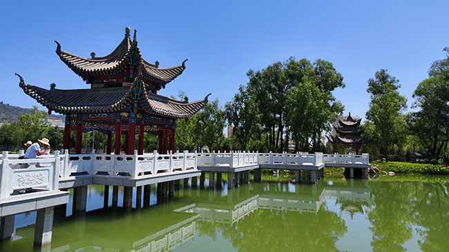 仿若山河画卷,堪称陇上江南。亭台水榭倚桥涵,满目葳蕤潋滟。 民族交融纽带,齐家文化摇篮。寻根溯祖意犹酣,大夏风情尽览。