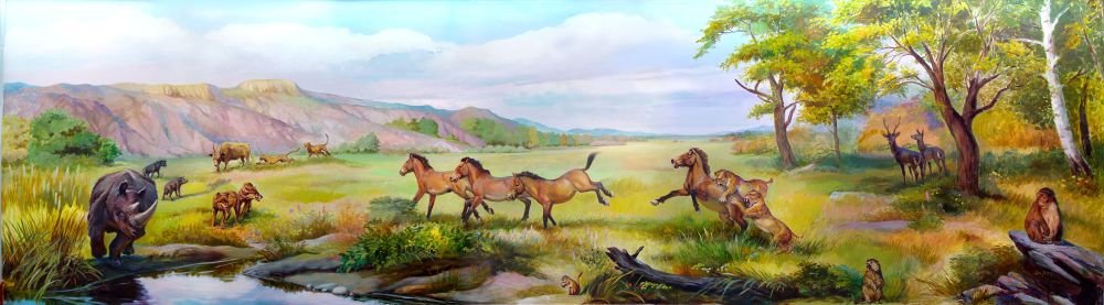 远古动物种群复原图:临夏三趾马动物群。