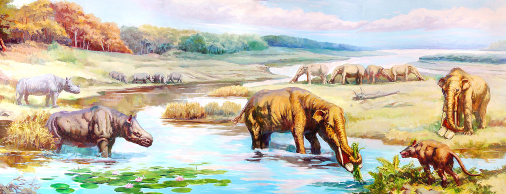 远古动物种群复原图:铲齿象动物群。