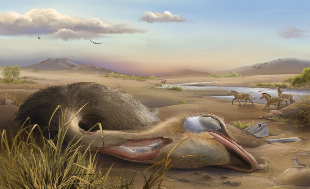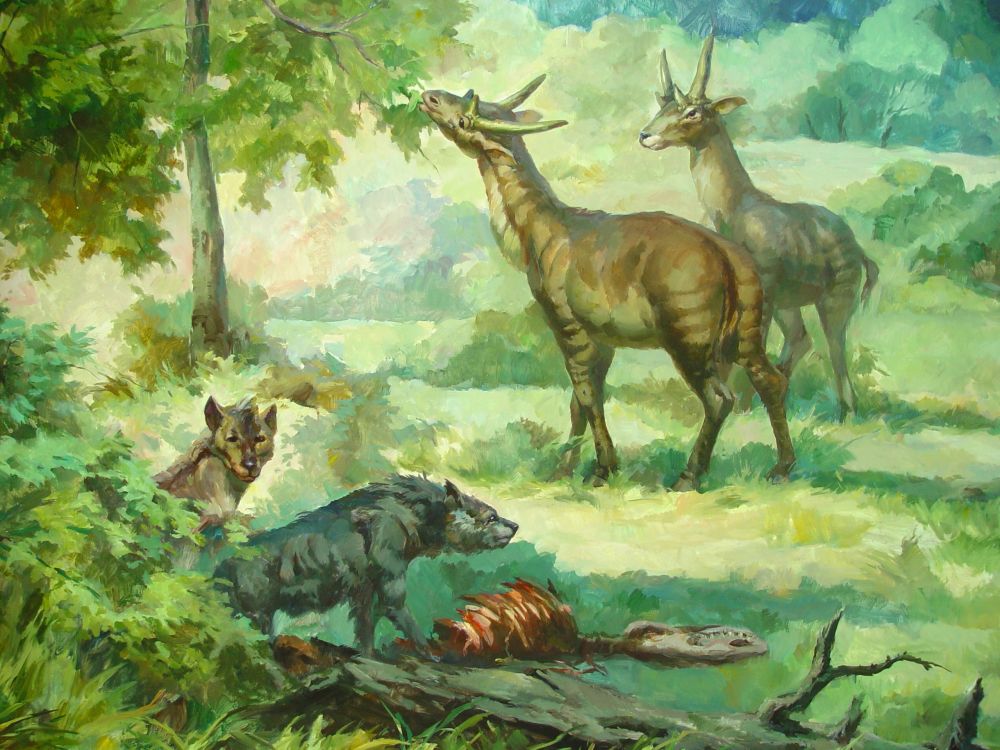 远古动物种群复原图:巨鬣狗。