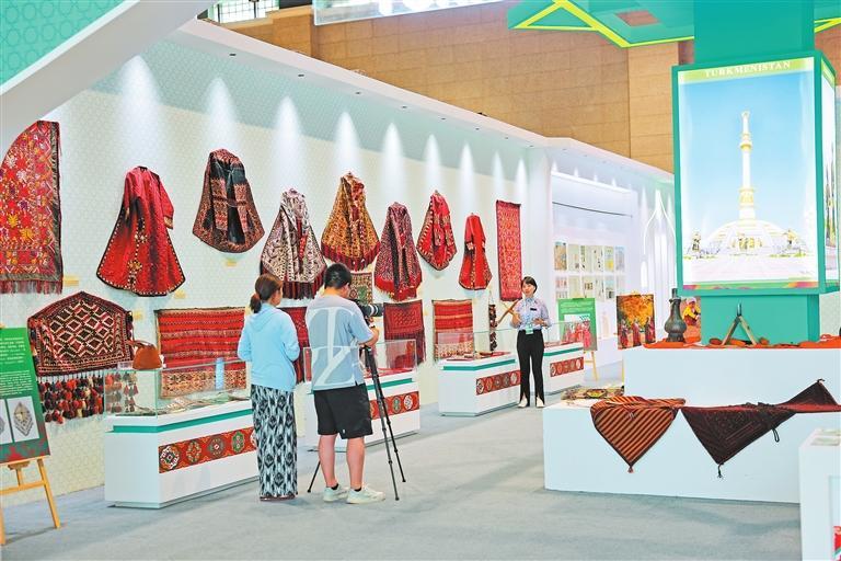 紧挨着土库曼斯坦展馆的是新疆维吾尔自治区展馆。新疆维吾尔自治区是本届敦煌文博会的主宾省,这是自2016年首届敦煌文博会举办以来首次设立主宾省。主宾省展馆内集中展示着新疆特色产品、旅游资源、非遗文创和甘新两省区合作交流的诸多成果。
