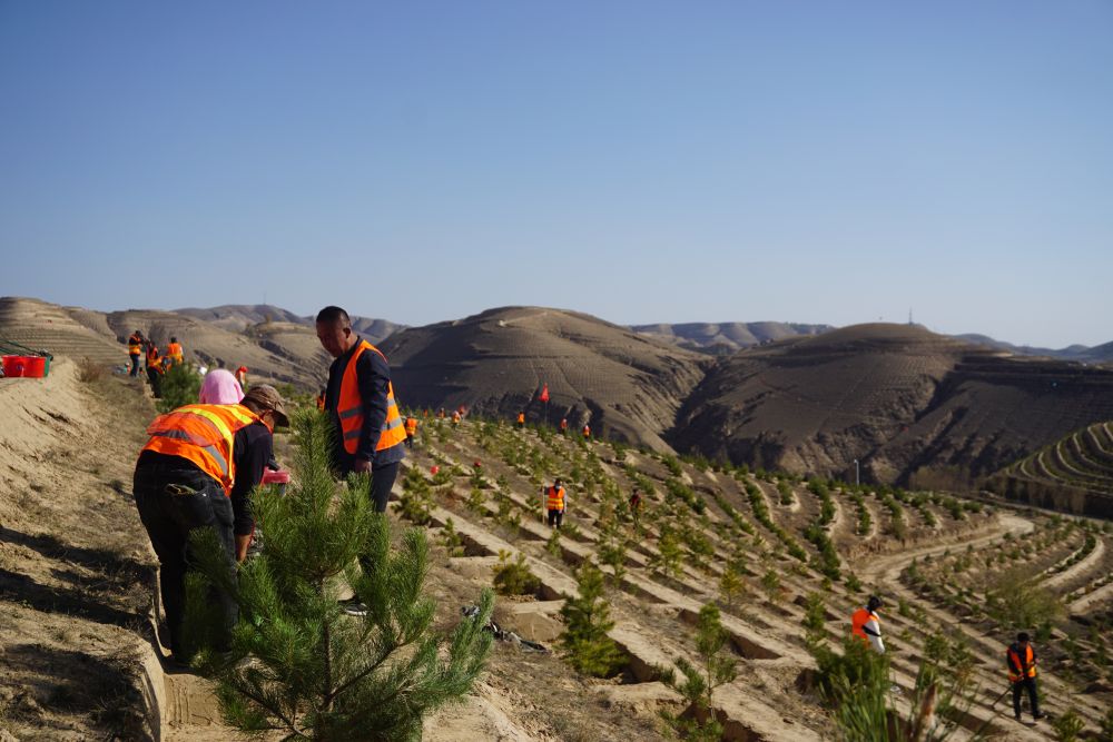 图为10月31日拍摄的甘肃省庆阳市环县毛乌素沙地防风固沙屏障项目田佛山治理点植树现场。(新华社记者 贾钊 摄)