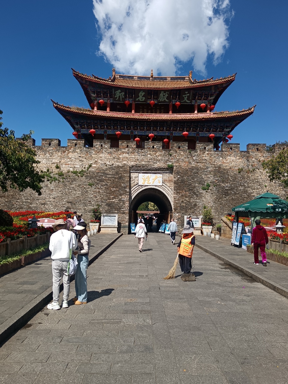 云南多山,占全省面积的百分之八十以上。大巴车载着我们,穿行于高山峡谷,看层林尽染的山色,望随处可见的山泉河流,行进于山道的雾霭濛濛,遥观脚下白云飘飘,听导游口若悬河,滔滔不绝,行车半日无寂寞。在笑语企盼中,到了文化名城一一大理城,史书中曾经的南昭国都。在此古城老街,观景听风一游。