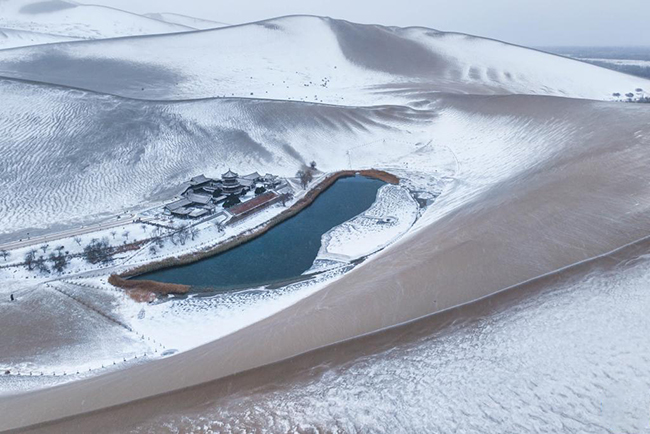 这是甘肃省敦煌市鸣沙山月牙泉景区雪景(12月14日摄)。