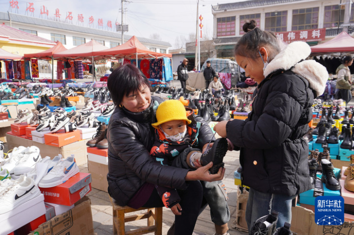 1月17日,甘肃省临夏州积石山县石塬镇村民在集市上买鞋。新华社记者 马希平 摄
