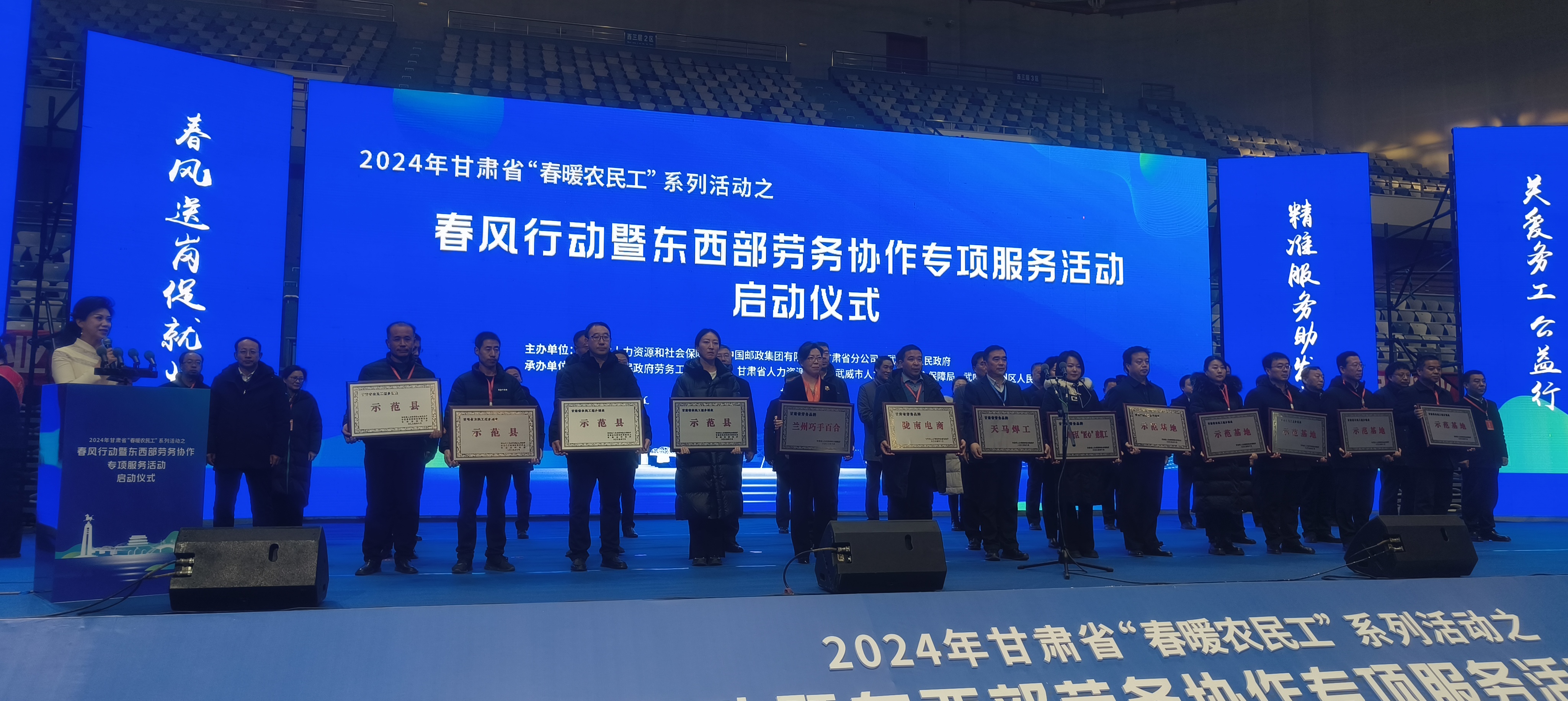 活动中,与会嘉宾为荣获2023年度省级农民工返乡创业示范县、省级农民工返乡创业示范基地、省级劳务品牌的市州代表进行授牌;中国邮政集团有限公司甘肃省分公司为脱贫劳动力免费捐赠春运车票2000张,为春节后有序返岗务工提供了有力保障。