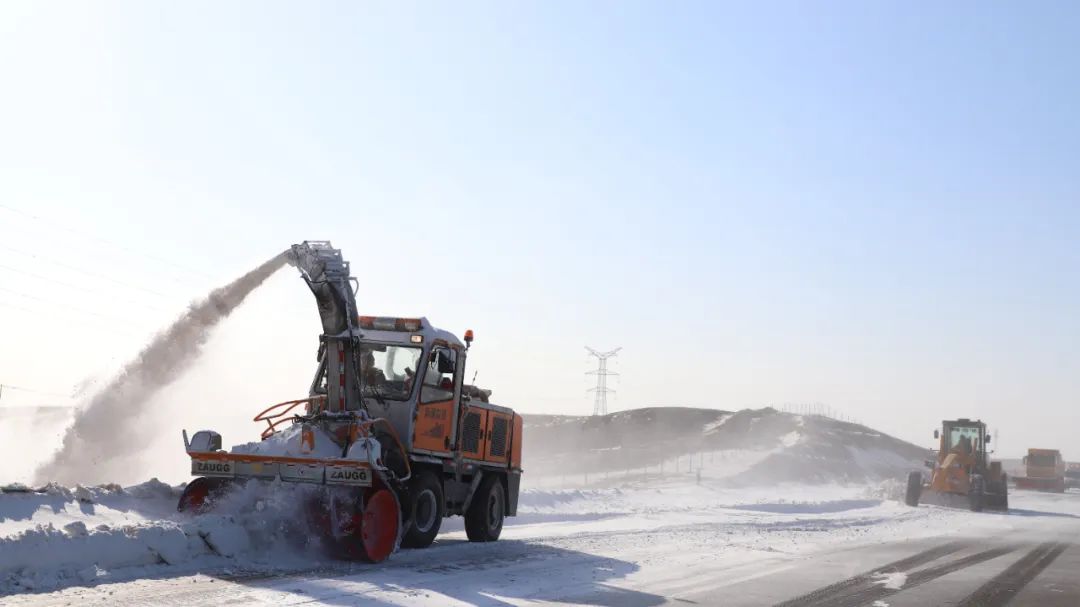 在G3014奎阿高速阿勒泰片区路段,北屯管理部员工全员出动,值守在高速公路开展除雪作业,重点对行车道、匝道、陡坡等结冰易滑路段加强雪情观测。他们不断巡逻、疏导交通,确保道路安全畅通。