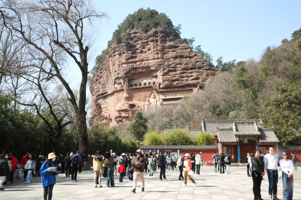 2024年3月20日,游客在天水市麦积区游览麦积山石窟。新华社记者马希平摄