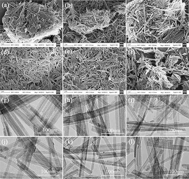 图1.凹凸棒石原矿(a,g)及其不同工艺条件下超声辅助解离后(b-f,h-l)的SEM和TEM图