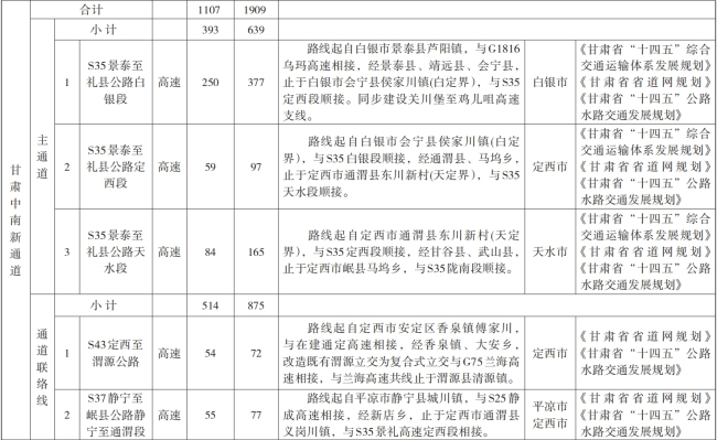 (二)甘肃中南高速公路新通道。该通道起于白银市景泰县、与G1816乌玛高速相接,止于陇南市礼县、与G7011十天高速相接,自北向南贯穿白银、定西、天水、陇南4市,辐射景泰、靖远、平川、会宁、安定、通渭、陇西、漳县、秦州、武山、甘谷、秦安、张家川、礼县、成县、徽县、康县、武都、文县19县(区)。该通道由1条主通道、8条通道联络线和5条通道辐射线构成。主通道全长约447公里(利用在建54公里、新建393公里),新建S35景泰至礼县高速景泰至马坞段,与在建S35陇南段相接形成主通道。带动建设S43定西至渭源、S37静宁至通渭、S37通渭至陇西、S37漳县至砖塔寨、G247通渭至秦安、S03天水绕城、S42武山至漳县、S68余家湾至文县(含文县至青川公路)等联络线和S50马鹿至张家川、S25天水镇至大门镇(天陇界)、S25大门镇(天陇界)至成县、S29康县至宁强(陕西)、S66两水至九寨沟(四川)等辐射线。
