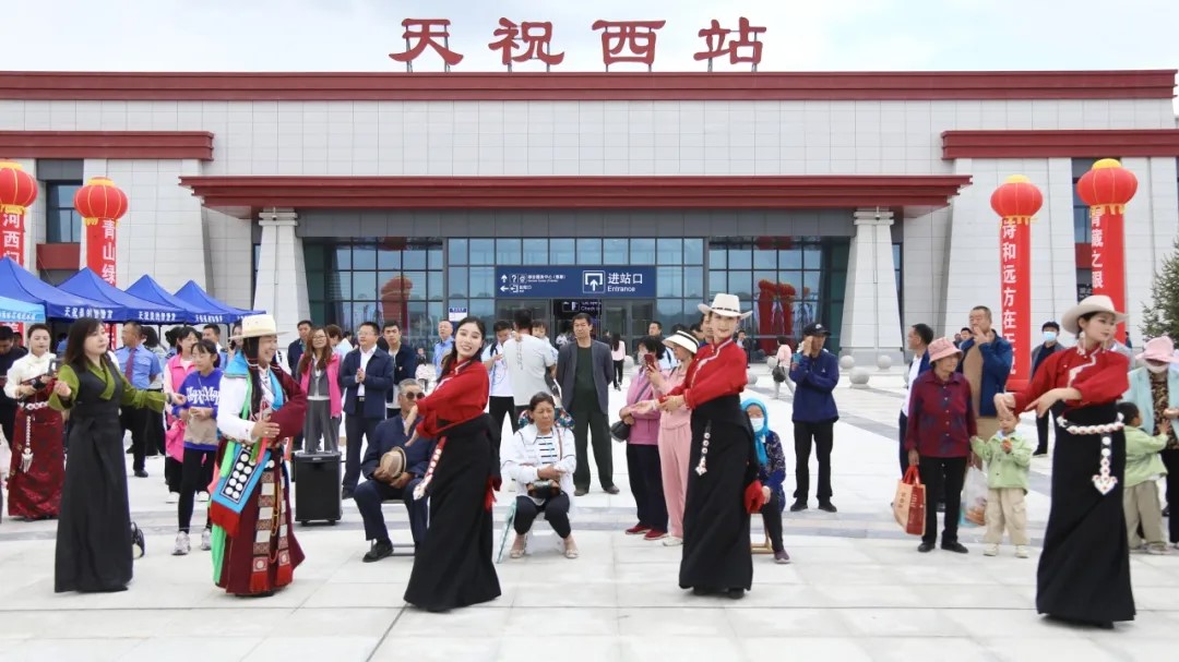 在天祝西站,藏族同胞们手捧哈达、载歌载舞欢庆高铁开通,跳锅庄、唱颂歌,迎接第一批旅客。