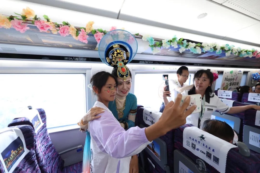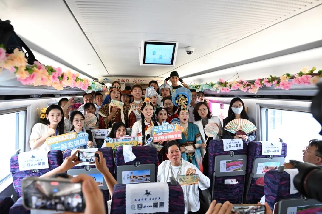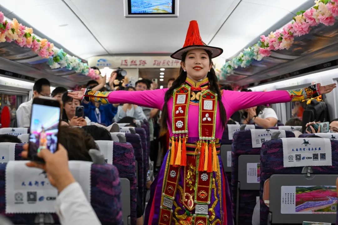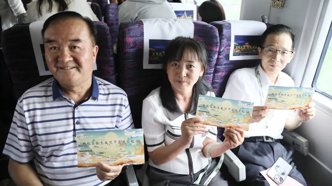 兰州客运段乘务员身着少数民族服饰,热情迎接八方来客。旅客在带有“铜奔马”“华藏寺”“兰州水车”等浓郁地域特色的合影框内“打卡”,并领取首发列车纪念卡片。