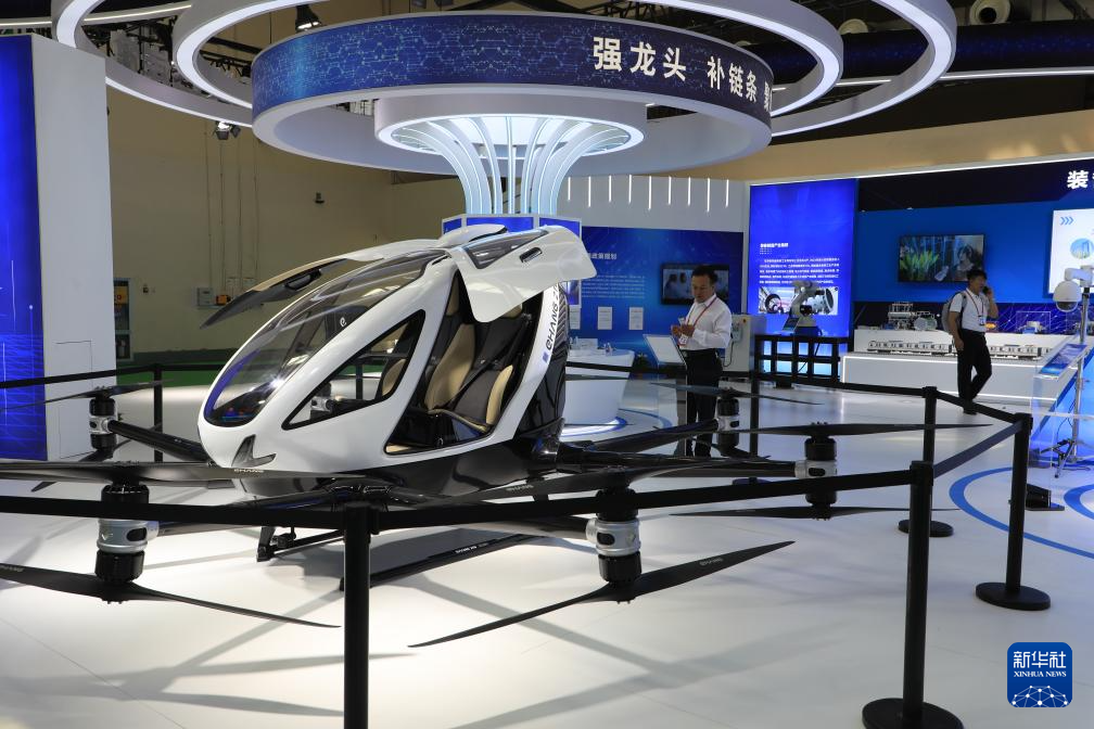 7月6日,在第三十届兰洽会主展馆,参会者参观电动载人自动驾驶飞行器。新华社记者张智敏摄