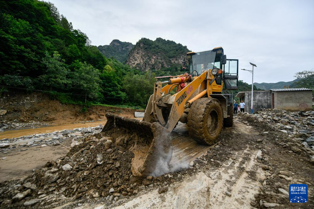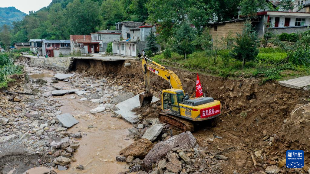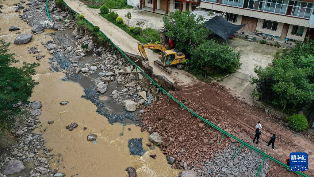 7月28日,在陇南市武都区黄坪镇楼房坝村,当地抢险救援人员在抢修受损农村公路。