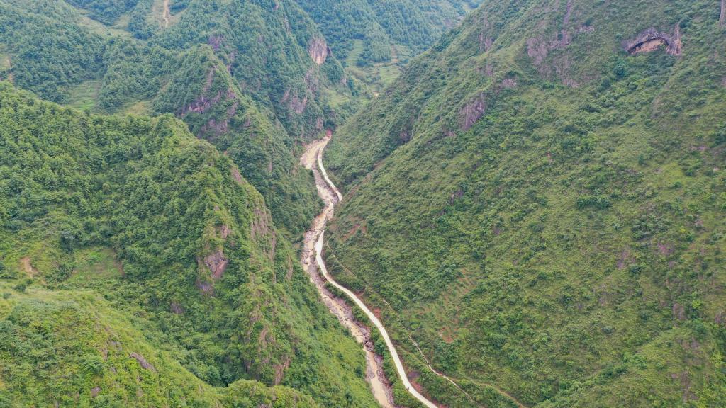 这是7月28日在陇南市武都区黄坪镇成坝村附近拍摄的一条农村公路。当地农村公路多依河谷而建,一旦遭遇山洪、滑坡、泥石流等灾害极易受损(无人机照片)。新华社记者郎兵兵 摄