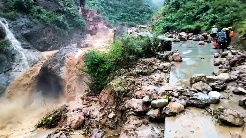 24日16时许,突击队一行5人身背卫星电话,脚踩雨靴踏上征程。行至一处被山洪冲毁的断头路时,突击队被站在路边观察汛情的10多名村民拦下。“里面的路都冲毁了,洪水很大,还有滑坡、落石,你们肯定走不进去,还是返回吧,安全第一!”村民们好心劝说。
