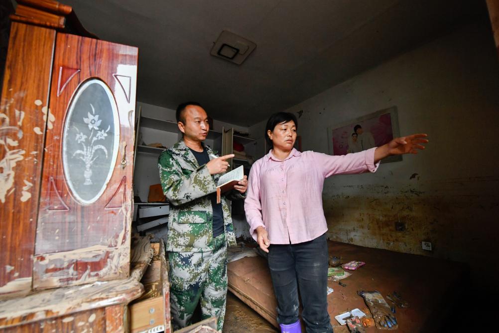 7月29日,在陇南市武都区黄坪镇黄坪村,赵春亮(左)入户查看灾情。新华社记者郎兵兵 摄