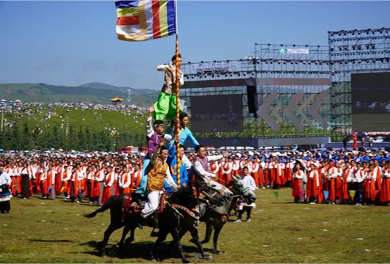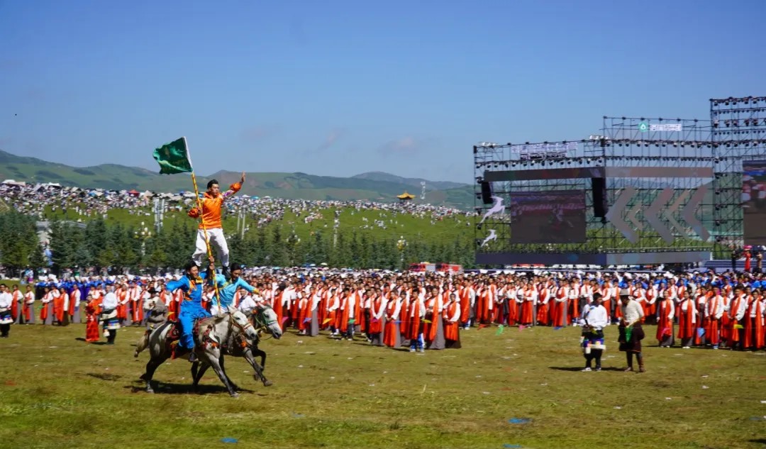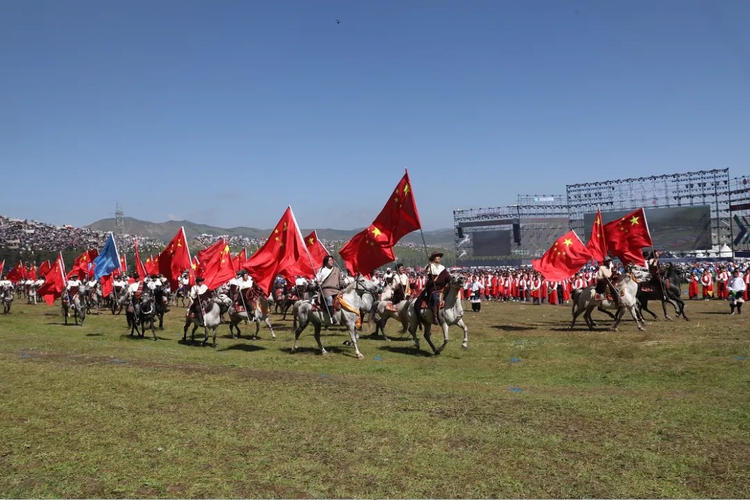 草原骑手乘着矫健的骏马高举着鲜艳的五星红旗从主席台前奔驰而过,让在场的数万观众赞叹不已,呈现出一个绚丽多彩的甘南、和谐稳定的甘南、朝气蓬勃的甘南、包容开放的甘南、团结奋进的甘南。