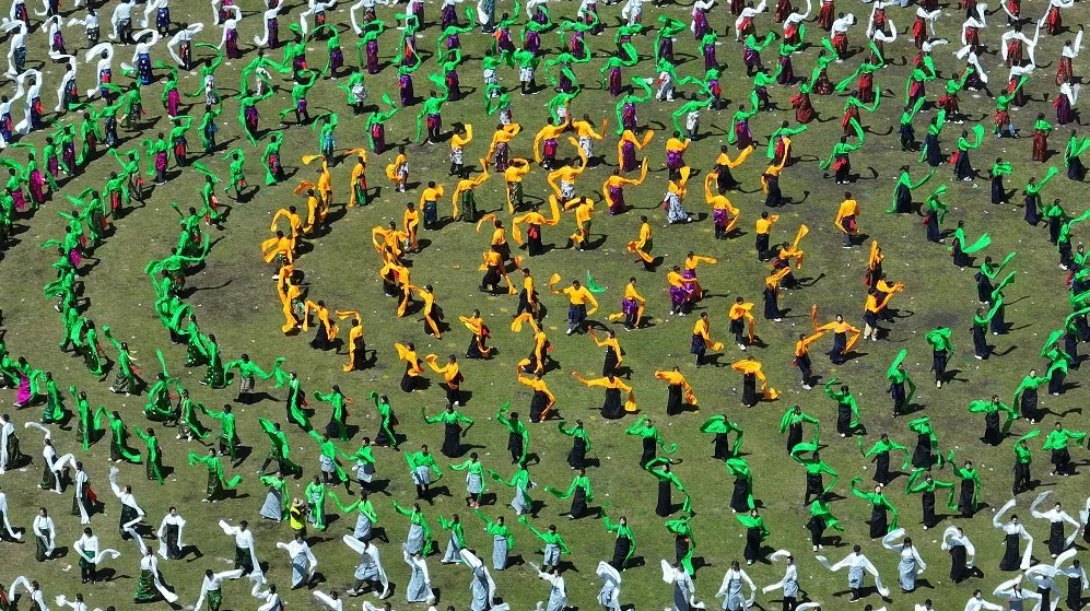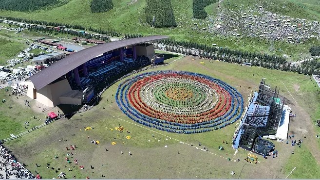 在欢快优美的乐曲声中,万人锅庄开始展演,动听的乐曲、飒爽的舞姿、五彩的服装,将甘南的生态之美、文化之美、民俗之美、和谐之美展示得淋漓尽致。圆圈形的锅庄舞表达了甘南人民在中国共产党领导下,各民族像石榴籽一样紧紧拥抱在一起,为推动甘南高质量发展,画出最大同心圆。