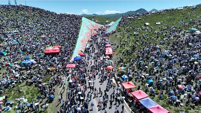 盛夏的甘南到了如诗如歌的最美季节,艳阳高照下的合作当周草原天蓝草碧格桑花开,数百顶洁白的帐篷和盛装出行的甘南各族群众将这里装扮成色彩斑斓的最美画卷。