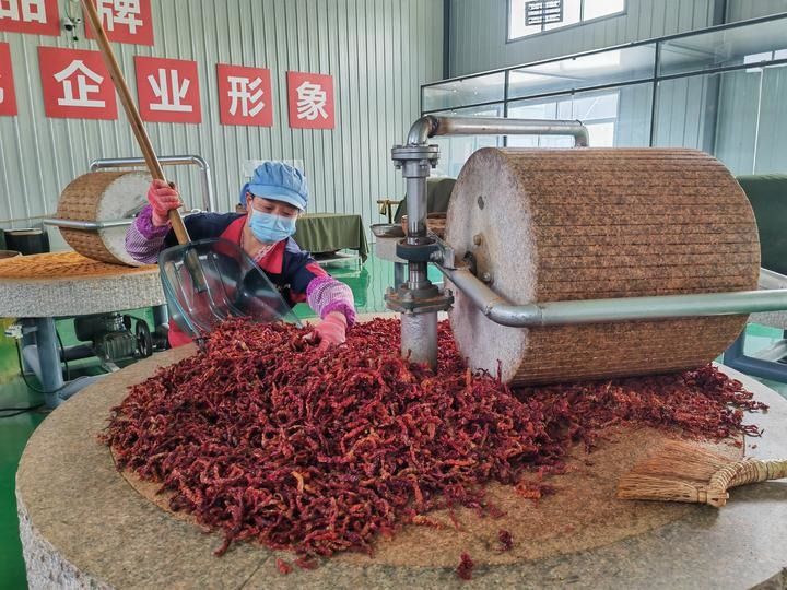 在天水丰晟农业综合开发有限责任公司的生产车间内,工作人员正在研磨干辣椒。新华社记者王紫轩摄