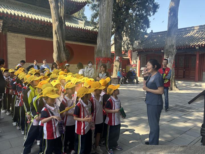 在天水市伏羲庙内,研学团的小学生们正在聆听讲解。新华社发(受访单位供图)