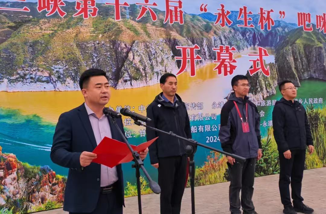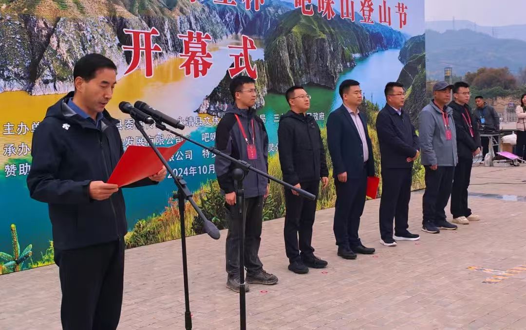 中共永靖县委宣传部副部长、县文体广电和旅游局党组书记、局长杨志飞首先在开幕式上讲话,并宣布黄河三峡第十六届“永生杯”吧咪山登山赛开赛。
