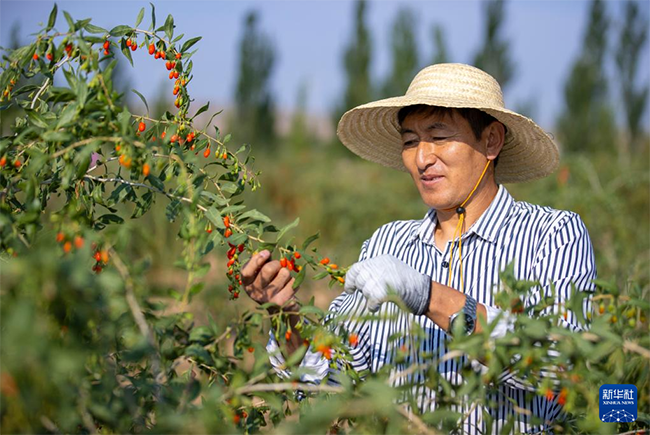 7月11日,宁夏吴忠市同心县下马关镇五里墩村的农户在采摘枸杞。新华社记者 杨植森 摄