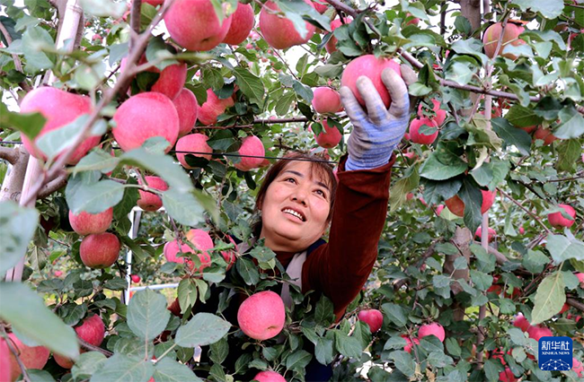 10月12日,甘肃省平凉市静宁县威戎镇杨桥村果农在采摘苹果。新华社发(王毅摄)