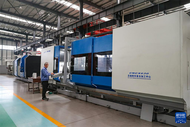 10月25日,在甘肃星火智能数控机床有限公司新厂区,高级工程师张宝生在数控机床装配车间对大型五轴铣车复合加工中心进行系统测试。该设备是星火机床吸收国外子公司法国索玛(SOMAB)公司的多轴先进制造理念及技术,融合星火大型设备制造经验开发的高端加工设备,针对中高速柴油机、凸轮轴等关键复杂零部件可一次装夹加工成型。新华社记者 郎兵兵 摄